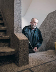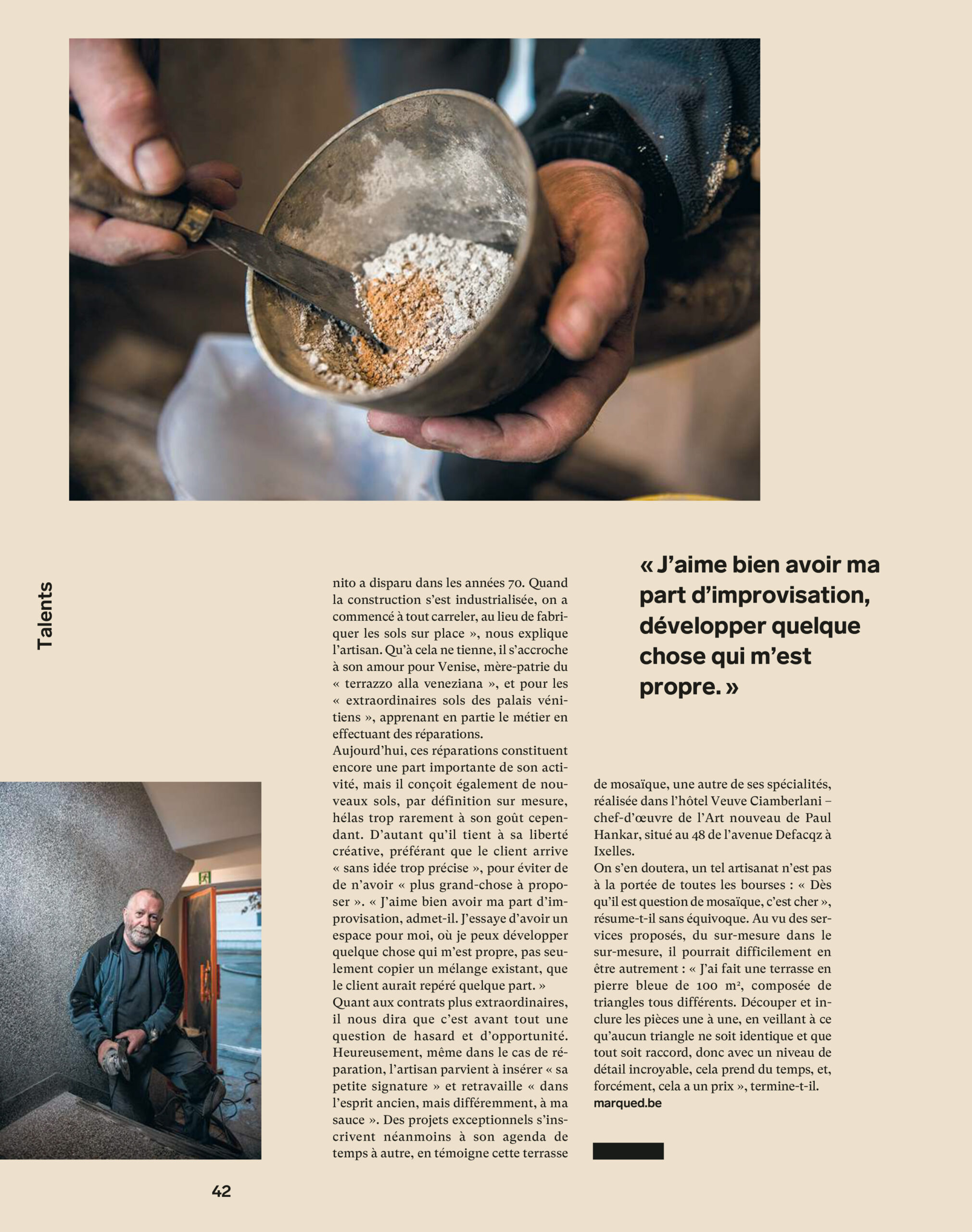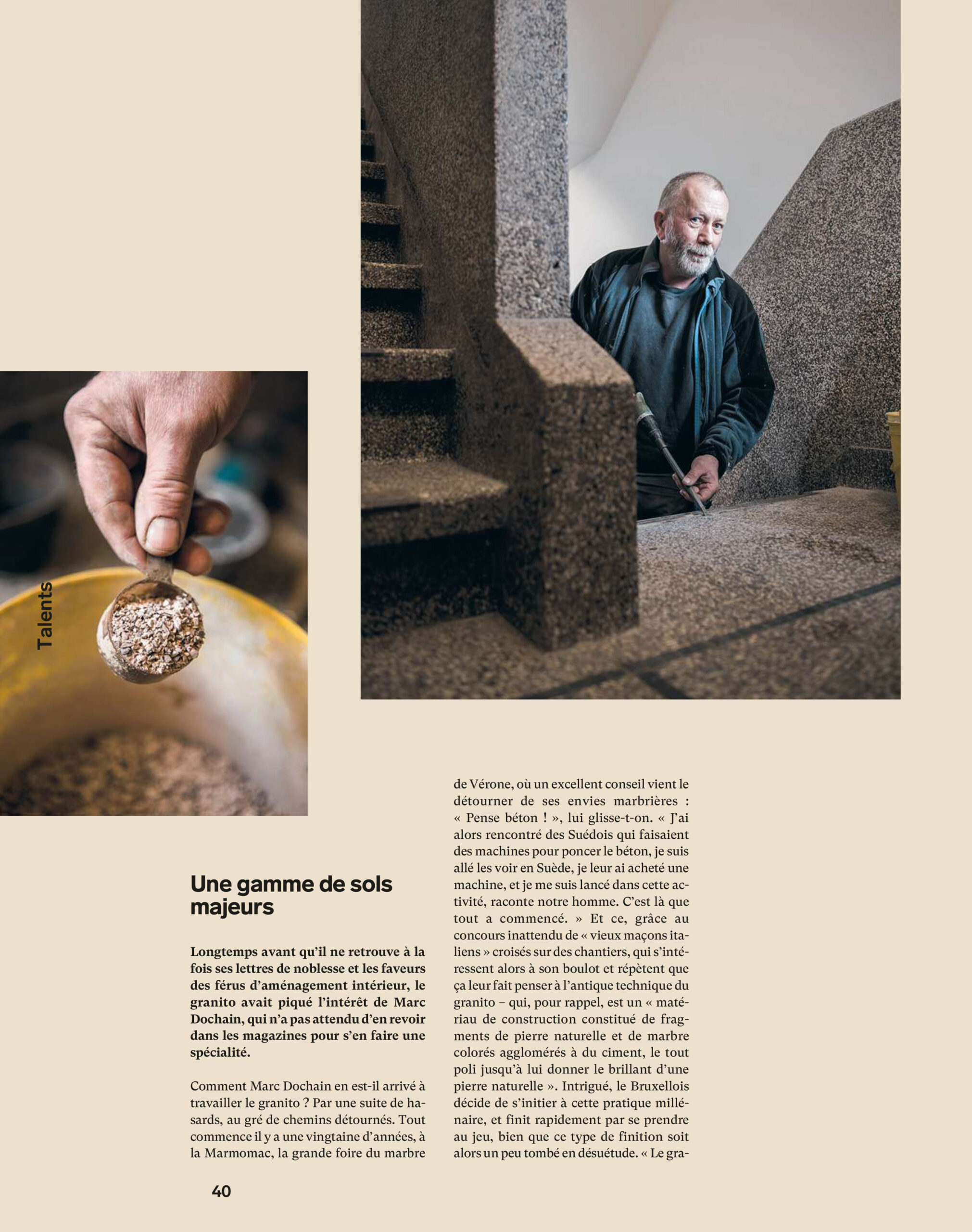 « Longtemps avant qu’il ne retrouve à la fois ses lettres de noblesse et les faveurs des férus d’aménagement intérieur, le granito avait piqué l’intérêt de Marc Dochain, qui n’a pas attendu d’en revoir dans les magazines pour s’en faire une spécialité. »